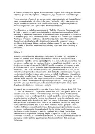 El graffiti tiene orígenes antiguos, pero surgió como cultura juvenil en Nueva York a finales de los años 1960 cuando adolescentes comenzaron a escribir sus nombres en las paredes de sus barrios. En los años 1970, el graffiti se desarrolló en una forma de arte callejera compleja con estilos de letra y competiciones entre artistas. Aunque enfrentó oposición en los años 1980, el resurgimiento del hip hop a mediados de esa década ayudó a revitalizar el graffiti en Nueva York.