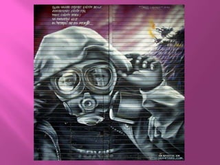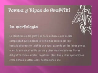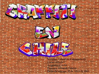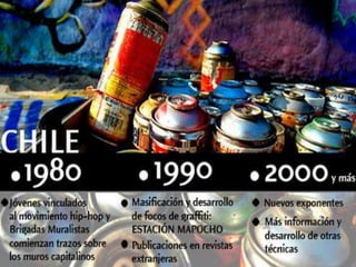 El documento resume la historia del graffiti en Chile. Comenzó como expresiones rudimentarias de los hombres prehistóricos y se desarrolló durante la independencia de Chile y los años 80 con brigadas políticas. En los 90 creció con la cultura hip hop. Existen dos tipos de graffiti: el europeo con mensajes políticos y el estadounidense ligado al hip hop. El graffiti chileno carece de identidad definida y surge de la necesidad de expresión de la gente.
