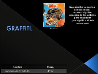 Jean-Michel Basquiat fue un pintor estadounidense nacido en 1960 en Brooklyn, Nueva York. Comenzó su carrera artística haciendo grafitis en las calles de Nueva York bajo el seudónimo SAMO. Rápidamente ganó reconocimiento y sus obras se exhibieron en importantes museos y galerías. Basquiat mezcló en su arte elementos del grafiti, el expresionismo abstracto y referencias a la cultura y la historia afroamericanas. Murió en 1988 a los 27 años por una sobredosis