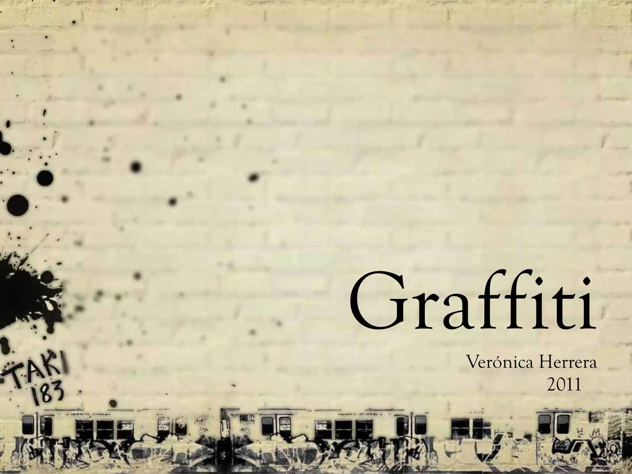 El documento describe el graffiti, definido como inscripciones o signos anónimos dibujados o pintados en edificios, muros o vagones de metro para testificar la presencia de su autor. Explica que el graffiti tiene sus orígenes en la antigua Roma y ha existido a lo largo de la historia. También describe el origen del graffiti moderno en Nueva York y Filadelfia en los años 70, su expansión en la cultura hip hop de los 80 y su actual consolidación como arte pese a los esfuerzos de las autoridades por impedir
