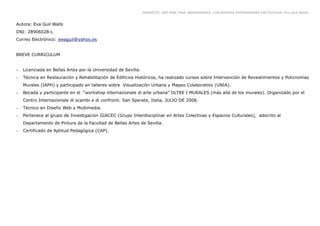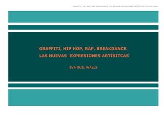 El documento describe las nuevas expresiones artísticas del graffiti, hip hop, rap y breakdance. Explica que el graffiti surgió en Nueva York en los años 1970 como una forma de expresión callejera y de protesta social. También presenta a algunos artistas pioneros como Taki 183 y Banksy. Finalmente, señala que estas expresiones artísticas están alineadas con la cultura y el estilo de vida urbano.