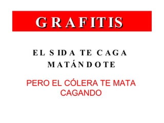 Este documento contiene una serie de frases y dichos modificados de forma humorística y ofensiva a través de grafitis. Los grafitis modifican el significado de las frases de manera obscena o políticamente incorrecta haciendo referencia a temas como el SIDA, las drogas, el racismo, el sexo y la religión.