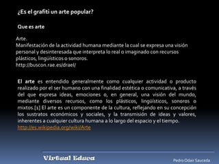 El documento discute si el grafiti puede considerarse un arte popular. Define arte de manera amplia como cualquier actividad o producto creado por humanos con una intención estética o comunicativa. Explica que el concepto de "arte popular" es ambiguo pero que los grafitis pueden clasificarse como tal dado que cumplen con definirse como una forma de expresión humana. Finalmente, concluye que tanto grafitis elaborados como más simples pueden considerarse una forma de arte para comunicar ideas e inspiraciones de sus creadores.