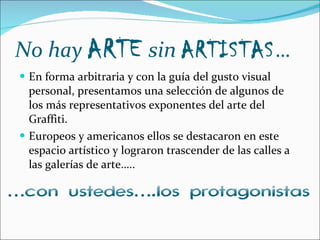 El documento presenta a varios artistas representativos del arte del graffiti, incluyendo a Shepard Fairey, Jean-Michel Basquiat y Banksy. También menciona a artistas latinoamericanos como Nunca de Brasil, Gualicho de Argentina y Sego y Ovbal de México. Describe brevemente el estilo y trayectoria de algunos de los artistas, resaltando su trascendencia desde las calles a las galerías de arte.