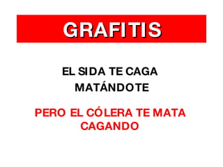 Este documento contiene una serie de frases y dichos populares seguidos de sus posibles interpretaciones alternativas sugeridas en forma de grafitis. Los grafitis juegan con el doble sentido de las palabras para darle un giro inesperado y a menudo ofensivo o obsceno a los significados originales.