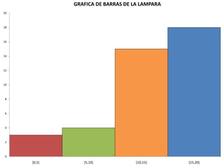 This document contains a table of values and bar graph analyzing the frequency and relative frequency of different ranges of values for an ecological lamp. The table shows the class marks, absolute and cumulative frequencies, relative frequencies as fractions, decimals, and percentages, and corresponding degree measures for 4 value ranges between 0 and 20. It then includes a bar graph visually representing the data from the table.