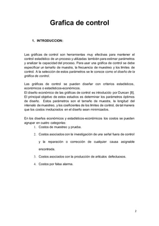 Este documento describe los gráficos de control, incluyendo su definición, objetivos, ventajas y desventajas. Explica los dos tipos principales de gráficos de control (variables y atributos) y cómo crear e interpretar un gráfico de control. También detalla los tres tipos de resultados posibles de un gráfico de control y cuándo indica que un proceso está funcionando mal.
