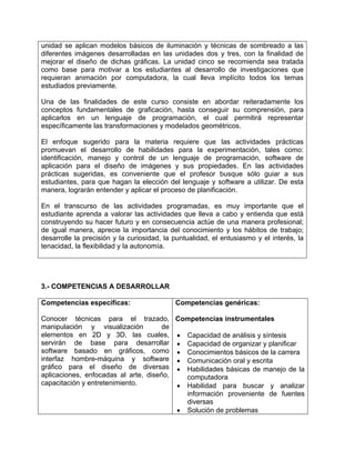Este documento presenta la asignatura de Graficación, parte de la carrera de Ingeniería en Sistemas Computacionales. La asignatura enseña técnicas de modelado gráfico 2D y 3D, iluminación y sombreado para el desarrollo de software gráfico y aplicaciones que requieran interfaces visuales. El temario cubre conceptos matemáticos, representación y manipulación de figuras, transformaciones geométricas, así como el uso de librerías gráficas. El objetivo es que los estudiantes aprendan a dise