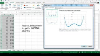 El documento describe los 9 pasos para graficar una función en Excel: 1) crear una tabla con valores de x e f(x), 2) incrementar x en intervalos constantes, 3) copiar la fórmula para todos los valores de x, 4) seleccionar los datos, 5) insertar un gráfico, 6) seleccionar un gráfico de dispersión de línea, 7) personalizar el diseño, 8) editar los títulos de los ejes, y 9) mover el gráfico a una ubicación deseada.