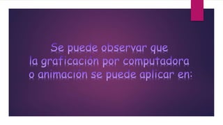 El documento describe diferentes usos de la computadora gráfica. Se utiliza en el diseño de construcciones, automóviles, aeronaves y embarcaciones para mostrar múltiples vistas de objetos. Los artistas usan métodos computacionales de hardware y software para diseñar formas y especificar movimientos. También se aplica en la producción de películas, videos y programas de televisión, así como para modificar o interpretar imágenes existentes. A menudo se usa como herramienta educativa para crear modelos de sistemas físicos, financieros