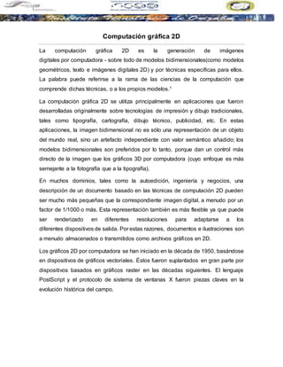 Este documento trata sobre la computación gráfica 2D. Explica que la computación gráfica 2D se usa principalmente en aplicaciones como tipografía, cartografía y dibujo técnico, donde las imágenes 2D tienen un valor semántico. También describe brevemente las transformaciones bidimensionales como traslación, rotación y escalación, indicando cómo se aplican a objetos y polígonos 2D.