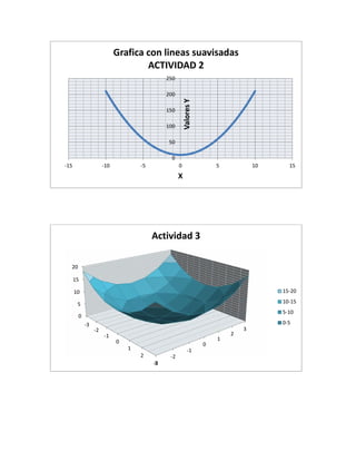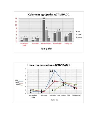 El documento muestra un gráfico de barras con la medalla de oro, plata y bronce obtenidas por diferentes países en los Juegos Olímpicos entre 1984 y 2000. También incluye gráficos de líneas y puntos que representan valores en función de X e Y. Por último, presenta preguntas sobre funciones matemáticas en Excel.