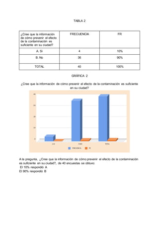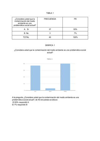 El documento presenta los resultados de una encuesta sobre contaminación ambiental y prevención realizada a 40 personas. Muestra que la mayoría (93%) considera que la contaminación ambiental es un problema actual y que la información sobre prevención es insuficiente (90%) en su ciudad. Todos (100%) apoyan las jornadas de limpieza en su hogar y casi todos (98%) creen que dar buen manejo a los desechos contribuye a la preservación ambiental. Sobre el enfoque CTS, la mayoría (70%) piensa que es interrelacionar ciencia, tecn