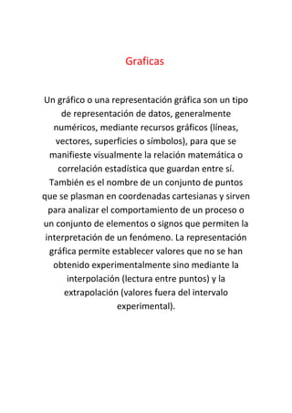 Este documento describe diferentes tipos de gráficas, incluyendo gráficos lineales, de barras, histogramas, circulares, y pictogramas. Explica que un gráfico es una representación visual de datos numéricos que muestra las relaciones matemáticas entre ellos. Luego define cada tipo de gráfica, describiendo cómo se usan para representar diferentes conjuntos de datos.