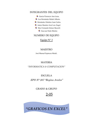Este documento presenta la información de un equipo de estudiantes que realizó un proyecto sobre los tipos de gráficos en Excel para la materia de Informática y Computación. El equipo estuvo conformado por 6 estudiantes del segundo grado del grupo 2-05 de la escuela EPO N° 267 "Regina Avalos" bajo la tutela del maestro José Manuel Espinoza Medel. El documento incluye una introducción y luego describe diversos tipos de gráficos como gráficos de columnas, líneas, circulares, de barras, de á