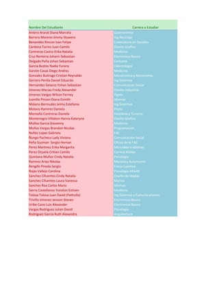 Este documento presenta una lista de 32 estudiantes con sus respectivos nombres, carreras a estudiar, universidades e planes para el futuro. La universidad con mayor número de estudiantes es la Nacional con 6, seguida de La Salle con 3. Las carreras con más estudiantes son medicina, electrónica básica y comunicación social con 3 cada una.