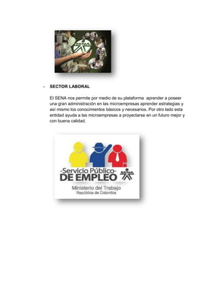 El documento describe las funciones del Sena en tres sectores principales: productivo y económico, educativo y laboral. En el sector productivo y económico, el Sena brinda oportunidades para crear empresas y desarrollar habilidades mediante los conocimientos adquiridos en la formación. En el sector educativo, el Sena facilita material de apoyo y cursos para fortalecer la educación. En el sector laboral, el Sena permite aprender estrategias de administración para microempresas y ayuda a su proyección futura.