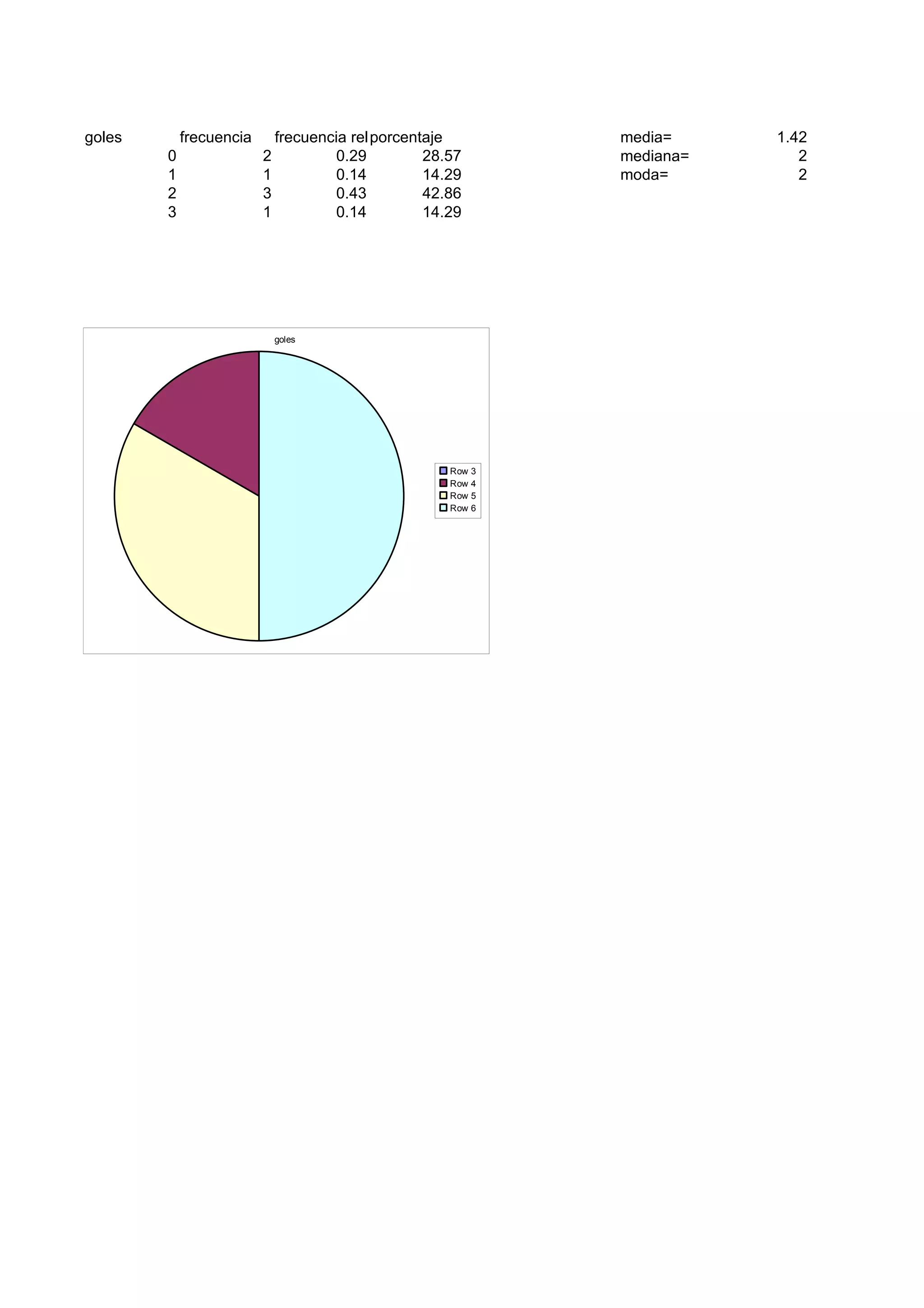 El documento presenta datos estadísticos sobre goles anotados en varios partidos. Muestra que la mayor frecuencia de goles anotados fue 2 goles, ocurriendo en 3 partidos; la media fue de 1.42 goles; y la mediana y moda fue 2 goles. Presenta también gráficos de barras que ilustran la frecuencia de goles anotados.