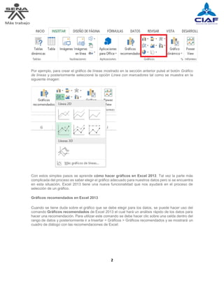 Este documento explica cómo crear gráficos en Excel para visualizar y resumir datos numéricos. Describe los pasos para insertar un gráfico, incluyendo seleccionar los datos, elegir un tipo de gráfico e insertarlo. También cubre opciones como crear gráficos recomendados automáticamente y mover gráficos a hojas separadas para imprimirlos de manera independiente.