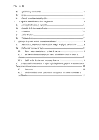 Este documento describe las partes principales de un gráfico y recomienda los tipos de gráficos adecuados para diferentes tipos de datos. Explica las 12 partes más importantes de un gráfico, incluidos los ejes, títulos, marcadores, etiquetas de datos y leyenda. También discute los tipos de gráficos como barras, líneas, histogramas y gráficos de dispersión que son adecuados para comparar datos entre categorías, en el tiempo o mostrar relaciones entre variables. Por último, proporciona consejos