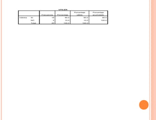 Este documento presenta estadísticas sobre 20 productos. Muestra que la mayoría de los productos utilizan materiales (90%), son elaborados con cacao (85%), tienen diseños (80%), y se venderán en centros educativos (50%). Todos los productos se pagarán en una gran cantidad de 5.