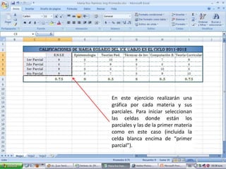 Este documento proporciona instrucciones para crear diferentes tipos de gráficos en Excel utilizando datos de calificaciones y materias. Explica cómo crear gráficos de barras para cada materia y sus parciales individualmente, así como un gráfico combinado para todos los promedios. También describe cómo personalizar los gráficos cambiando los colores, leyendas y títulos, y eliminar gráficos no deseados.