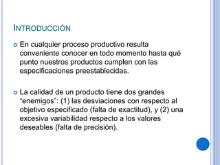 Este documento describe los gráficos de control, los cuales se utilizan para estudiar y determinar la variación de un proceso. Explica los diferentes tipos de gráficos de control como gráficas X-R, X-S y M-R, y cómo interpretarlos para determinar si un proceso está bajo control o no. También cubre conceptos como límites de control, puntos fuera de límites, adhesión y series, los cuales son importantes para evaluar si un proceso requiere acciones correctivas.