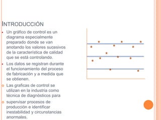 Este documento describe los gráficos de control, los cuales son diagramas utilizados para monitorear procesos de producción e identificar inestabilidad. Explica cómo construir gráficos X-R mediante la recolección y análisis de datos, y cómo interpretar los gráficos resultantes para detectar cambios en el proceso y asegurar la calidad.