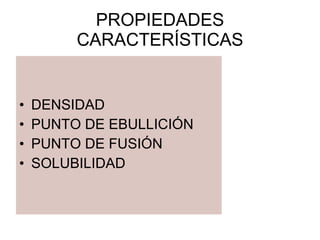 El documento presenta información sobre propiedades físicas como densidad y cómo se representan gráficamente relaciones como masa vs volumen. Explica cómo calcular la pendiente en un gráfico y cómo determinar cuál de tres materiales tiene mayor pendiente y densidad al analizar un gráfico de masa vs volumen. También describe qué sucede con la masa y el volumen cuando se mantienen constantes uno u otro para diferentes materiales.