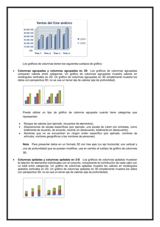 Este documento describe los diferentes tipos de gráficos estadísticos que se pueden crear en Microsoft Excel, incluyendo gráficos de columnas, líneas, circulares, de barras, de área, de dispersión, de cotizaciones y más. Explica las características y usos de cada tipo de gráfico. El documento también proporciona consejos sobre cuándo usar cada tipo de gráfico para representar mejor los datos.