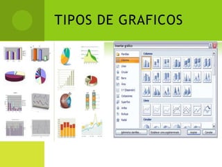 El documento proporciona instrucciones en 4 pasos para crear un gráfico en Excel, incluyendo la creación de una base de datos, seleccionar los datos, elegir un tipo de gráfico e insertarlo. También incluye un ejercicio para crear un gráfico del rendimiento académico de un grado usando Excel y enviarlo por correo electrónico.