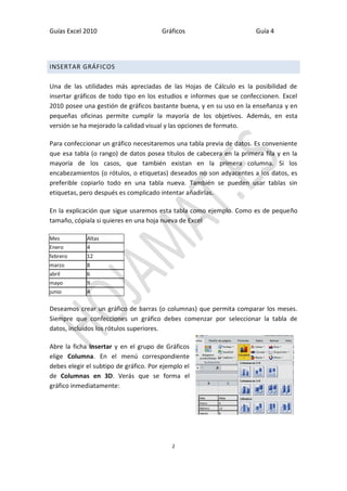 Este documento proporciona una guía sobre cómo crear y personalizar diferentes tipos de gráficos en Excel 2010. Explica cómo insertar gráficos, modificar sus opciones y estilos, y describe gráficos circulares, de barras, líneas y dispersión. También cubre complementos como líneas de tendencia, pictogramas y consejos para seleccionar y diseñar gráficos.