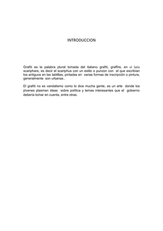 Este documento resume el grafiti en 3 oraciones. Explica que el grafiti surgió en la década de 1970 en Nueva York cuando adolescentes escribían sus nombres en las paredes. Luego, uno llamado Taki 183 se hizo famoso por escribir su apodo y dirección en el metro, inspirando a otros a imitarlo. Finalmente, el documento describe brevemente los diferentes géneros y estilos de grafiti que han evolucionado a través de los años.
