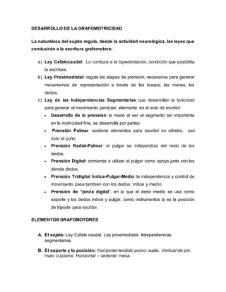 Este documento describe la grafomotricidad en la atención temprana infantil. Define la grafomotricidad como la capacidad de escribir o manipular utensilios que dejen trazos. Explica que la grafomotricidad involucra factores motores, perceptivos y representativos. También describe las etapas del desarrollo grafomotor y ejemplos de actividades grafomotoras para cada edad. Finalmente, destaca las ventajas de desarrollar la grafomotricidad temprana pero también las posibles desventajas