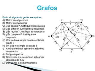 Este documento presenta un problema sobre grafos y dígrafos. Para un grafo no dirigido se pide encontrar la matriz de adyacencia, verificar si es conexo, simple, regular, completo, etc. También se pide encontrar cadenas, ciclos y demostrar si es euleriano o hamiltoniano. Para un dígrafo se pide encontrar la matriz de conexión, verificar si es simple, encontrar cadenas y ciclos, demostrar si es fuertemente conexo y encontrar distancias usando Dijkstra. El documento contiene las definiciones y pasos para resolver cada