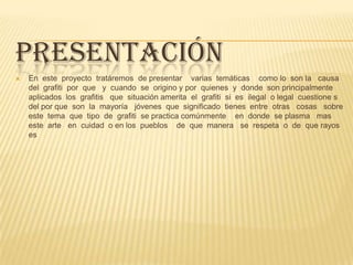 El documento trata sobre el grafiti. Explica que el grafiti se originó en la antigua Roma, donde la gente escribía y dibujaba en las paredes. Más tarde, en el siglo XIX, la policía encontró un grafiti escrito con sangre relacionado con el caso de Jack el Destripador. En la década de 1940, soldados estadounidenses encontraron repetidamente el grafiti "Kilroy was here" en Europa durante la Segunda Guerra Mundial. El documento también describe la historia del grafiti en Filadelf