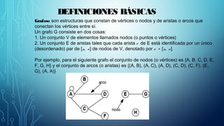 El documento presenta una introducción a los grafos, definiendo conceptos básicos como vértices, aristas, dígrafos, multígrafos, ciclos y caminos, así como propiedades importantes y teoremas relacionados con el isomorfismo y la conectividad. También se exploran grafos especiales como los eulerianos y hamiltonianos, describiendo problemas asociados como el problema del cartero chino y el problema del viajante de comercio, junto con el algoritmo de Dijkstra para encontrar caminos más cortos. Además, se menciona la estructura de árboles y árboles de búsqueda binaria como aplicaciones de grafos en la informática.