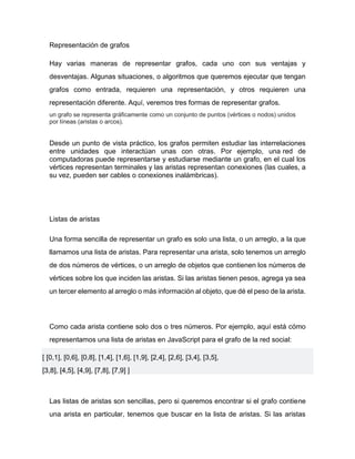 Este documento presenta diferentes formas de representar grafos, incluyendo listas de aristas, matrices de adyacencia y matrices de incidencia. Explica las ventajas y desventajas de cada representación, así como conceptos clave de teoría de grafos como caminos, circuitos, grafos conexos y más.