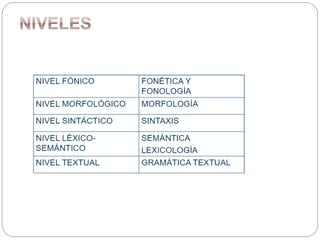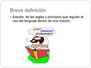 La gramática española estudia las reglas y principios que regulan el uso del lenguaje dentro de una oración. Se divide en diferentes tipos de gramáticas como la morfología, sintaxis y semántica.