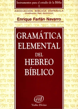 Este documento presenta una gramática elemental del hebreo bíblico. La introducción describe brevemente la clasificación del hebreo como lengua semítica y su relación con otros idiomas como el arameo y el fenicio. La primera parte cubre los signos gráficos del alfabeto hebreo y su fonética. La segunda parte se enfoca en las vocales hebreas. El documento provee una guía concisa pero completa para el estudio inicial de la lengua hebrea de la Biblia.