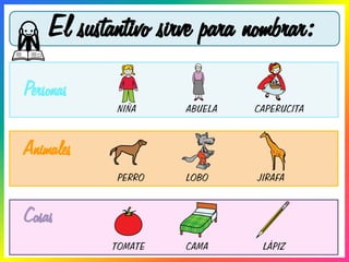 Este documento explica las características principales del sustantivo. Los sustantivos sirven para nombrar personas, animales y cosas. Pueden ser comunes o propios, masculinos o femeninos, y estar en singular o plural. También pueden indicar género y número a través del uso de artículos como "el" o "la". El documento proporciona ejemplos para ilustrar estas características y ejercicios para practicar el uso de sustantivos.