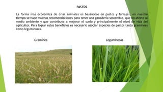 Las gramíneas (Poaceae) son una familia de plantas herbáceas o poco leñosas que incluye pastos y cereales. Son importantes para la alimentación animal y humana, el control de la erosión y la industria. Se reproducen sexualmente a través de la polinización o asexualmente mediante rizomas y estolones. Morfológicamente presentan hojas con vaina y limbo, tallos con entrenudos y nudos, raíces fasciculadas, espiguillas con brácteas, estambres y granos.