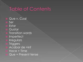 Este documento proporciona información sobre varios temas gramaticales en español, incluyendo la diferencia entre que y cual, el uso de los verbos ser y estar, verbos como gustar, palabras de transición, el imperfecto, verbos irregulares, marcadores de tiempo como hace + tiempo, que + presente, pronombres de objeto directo y su colocación, y el pretérito.