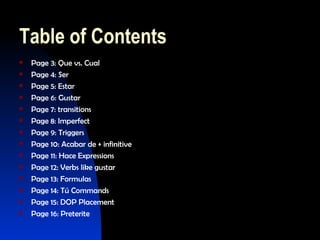 Este documento contiene una guía de gramática española de 15 páginas. Explica conceptos como el uso de "que" y "cual", verbos como "ser" y "estar", la conjugación del imperfecto, fórmulas comunes como "hace" y "gustar", y más.