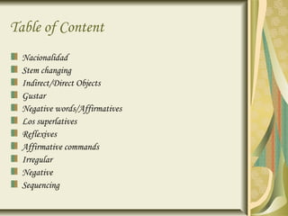 Este documento proporciona una guía de gramática en español. Explica conceptos como nacionalidades, verbos con cambio de raíz, objetos directos e indirectos, el verbo gustar, palabras negativas y afirmativas, superlativos, verbos reflexivos, mandatos afirmativos, verbos irregulares, tiempos verbales como el pretérito, y secuencias temporales. También incluye tablas y ejemplos para ilustrar estos conceptos gramaticales.