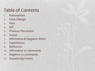 Este documento contiene información sobre varios temas de gramática española, incluyendo nacionalidades, cambios de raíz, "para", pronombres de objeto indirecto y directo, el uso de "gustar", palabras afirmativas y negativas, superlativos, verbos reflexivos, mandatos afirmativos y negativos en español, y secuencias de eventos.