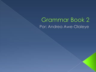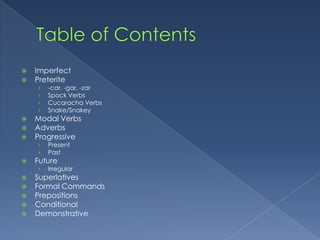 Este documento proporciona una guía sobre varios temas gramaticales en español, incluyendo el pretérito, verbos modales, progresivos, futuro, superlativos, mandatos formales, preposiciones, condicionales, demostrativos y números ordinales. Resume los puntos principales de la gramática española para ayudar a los estudiantes.