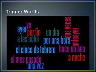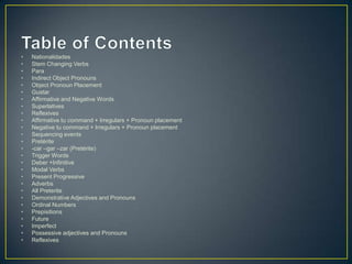 Este documento proporciona una lista de temas gramaticales en español, incluyendo verbos regulares e irregulares, pronombres, tiempos verbales como el pretérito y el imperfecto, adjetivos y adverbios, y más. La lista incluye definiciones breves y ejemplos de cada tema.