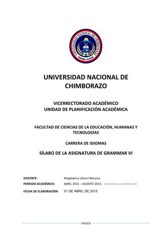 Este sílabo describe la asignatura Grammar VI que se imparte en la Universidad Nacional de Chimborazo. La asignatura se enfoca en la gramática inglesa contemporánea, explorando el uso de estructuras gramaticales al hablar y escribir. El curso contribuye a la formación profesional de los estudiantes de la carrera de Idiomas al desarrollar las cuatro habilidades del idioma inglés. El sílabo incluye los objetivos, contenidos, metodología y sistema de evaluación de la asignatura.