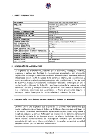 Este documento presenta la sílabus de la asignatura Grammar VIII de la Carrera de Idiomas de la Universidad Nacional de Chimborazo. La asignatura se enfoca en el desarrollo de habilidades gramaticales avanzadas en inglés, con énfasis en los usos de los condicionales, cláusulas y tiempo verbal. La asignatura contribuye al perfil de egreso de la carrera al mejorar las destrezas comunicativas en inglés de los estudiantes. La evaluación incluye proyectos, pruebas escritas y orales